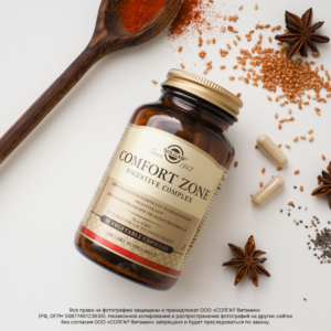 Комплекс Комфорт Зон от Solgar, содержащий 11 растительных пищеварительных ферментов, способствует улучшению пищеварения, помогая вам получать необходимые питательные вещества из пищи. Он также включает фитосмесь из кумина, фенхеля, ромашки, имбиря и аниса. Комплекс Комфорт Зон также помогает организму перерабатывать тяжелую пищу, чтобы вы спокойно могли насладиться вашими любимыми продуктами.