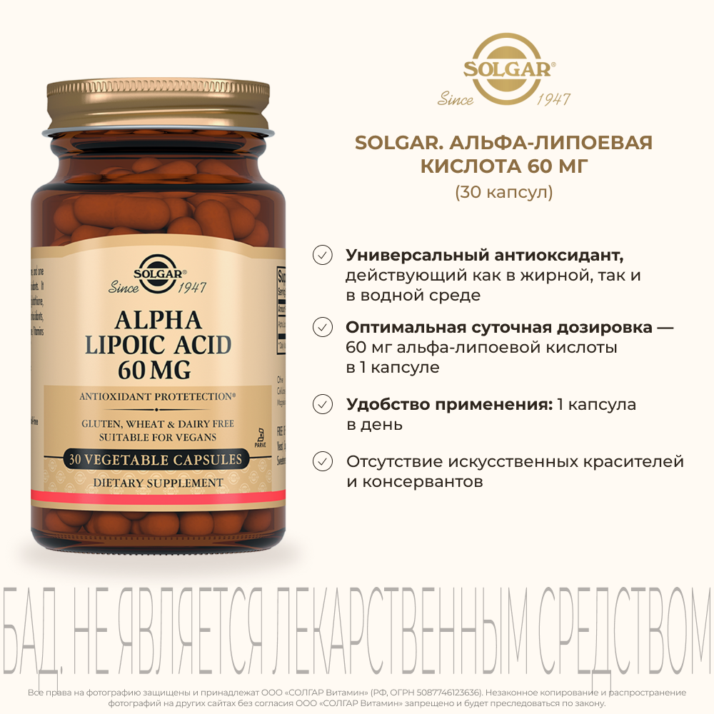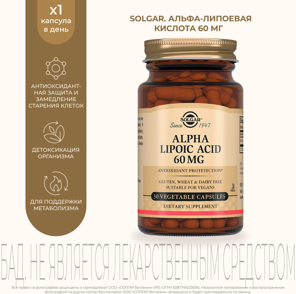 Альфа-липоевая кислота способствует нейтрализации свободных радикалов и замедлению процессов старения. Участвует в регуляции углеводного обмена и поддерживает нормальный уровень глюкозы в крови. Помогает организму в выведении солей тяжелых металлов и других токсичных веществ. Участвует в энергетическом обмене, способствуя повышению физической активности.