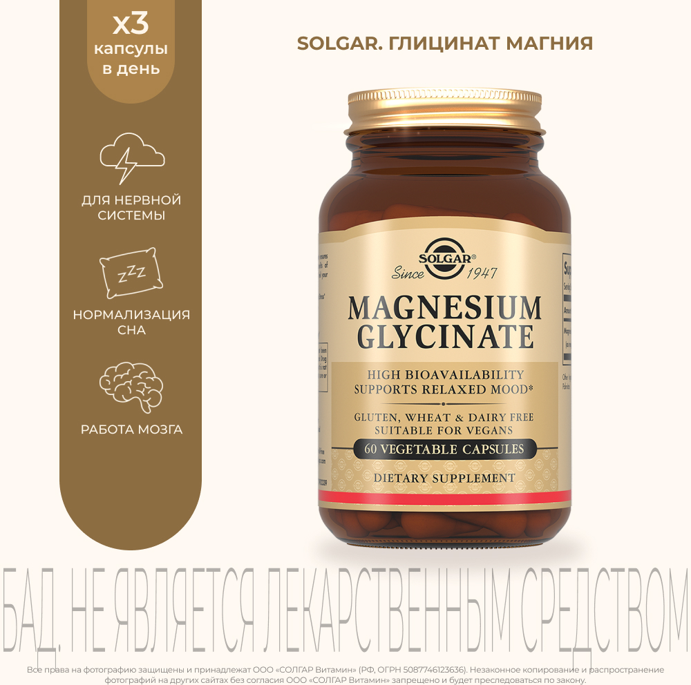 Глицинат магния способствует восстановлению баланса магния, нарушенного вследствие стресса и умственных нагрузок. Поддерживает нормальную функцию нервной системы, улучшает качество сна и когнитивные функции. Хелатная форма обеспечивает высокую биодоступность и эффективное усвоение без раздражения желудочно-кишечного тракта. Регулярный прием помогает нормализовать состояние при стрессе и дефиците магния, а также поддерживает общее самочувствие.