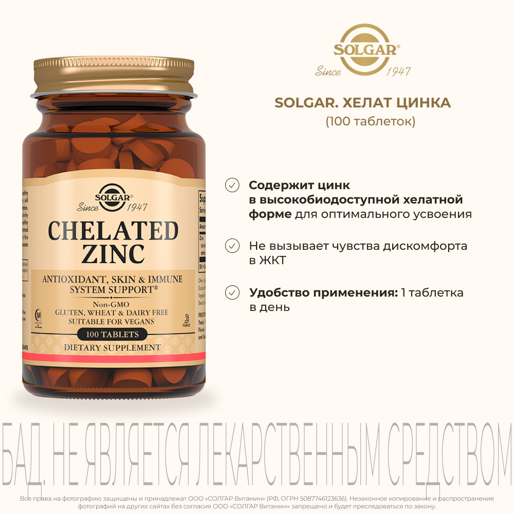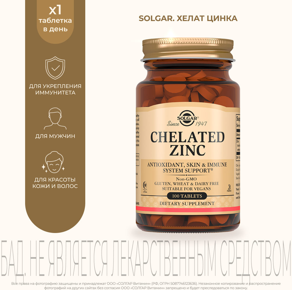 Практически единственный вариант цинка, который действительно работает. Пропивал банку этого цинка и других производителей, далее сдавал анализы, только после Solgar был реальный результат.