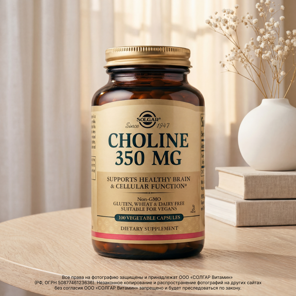 Холин поддерживает нормальную работу мозга и нервной системы, способствует сохранению памяти и концентрации внимания. Участвует в синтезе ацетилхолина — важного нейромедиатора, необходимого для передачи нервных импульсов. Важен для поддержки обмена веществ и функций печени, способствуя нормальному транспорту и выведению жиров.