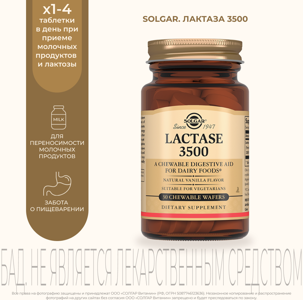 • Содержит фермент лактазу в высокой концентрации (лактазная активность — 3500 единиц/таблетка)