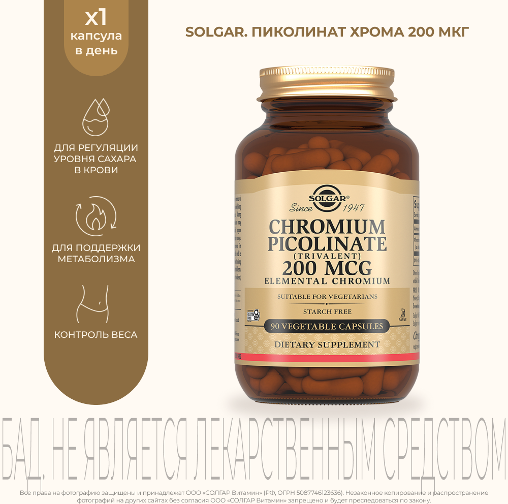 Хром участвует в углеводном обмене, способствуя поддержанию нормального метаболизма глюкозы. Пиколинатная форма обеспечивает высокую биодоступность микроэлемента.